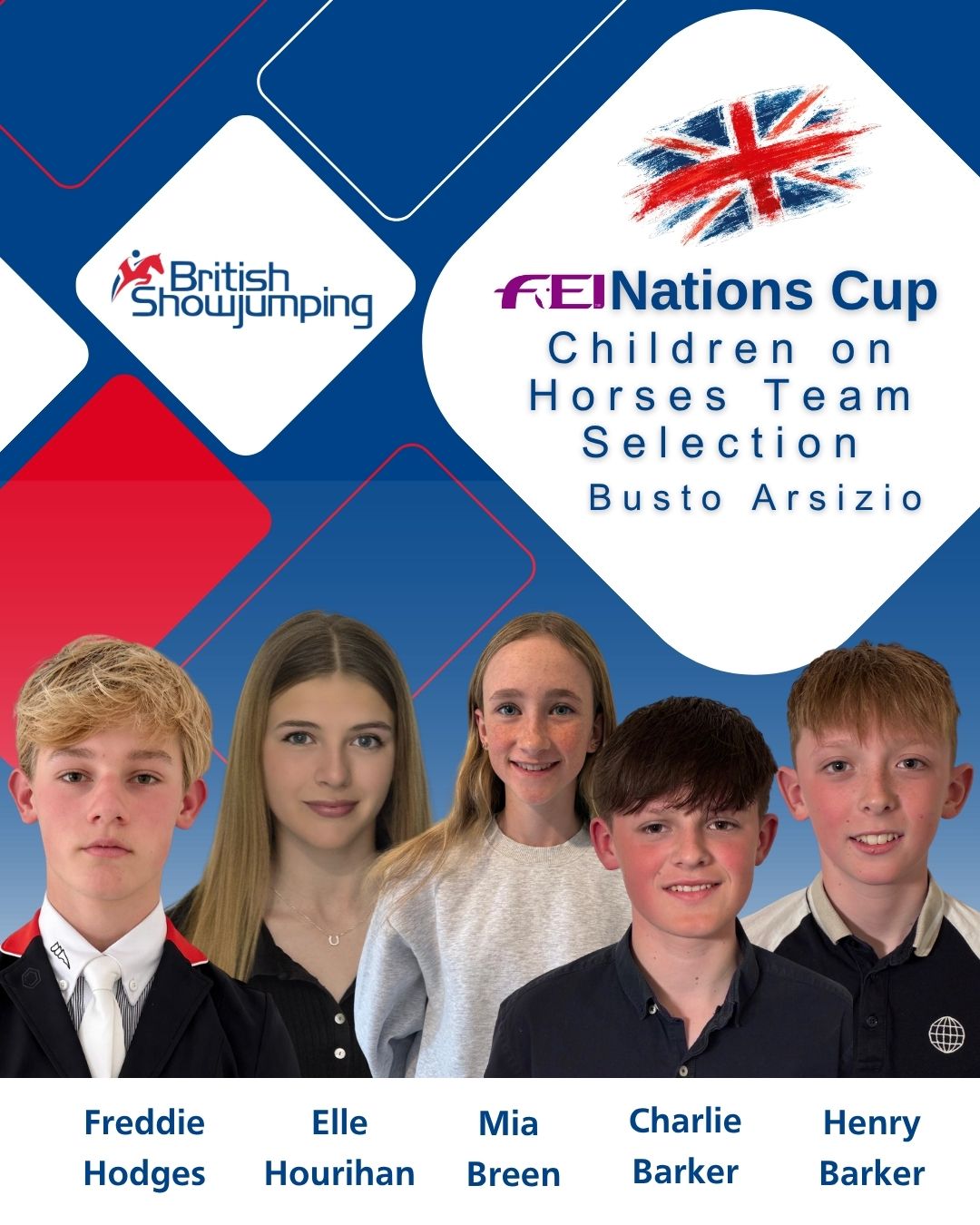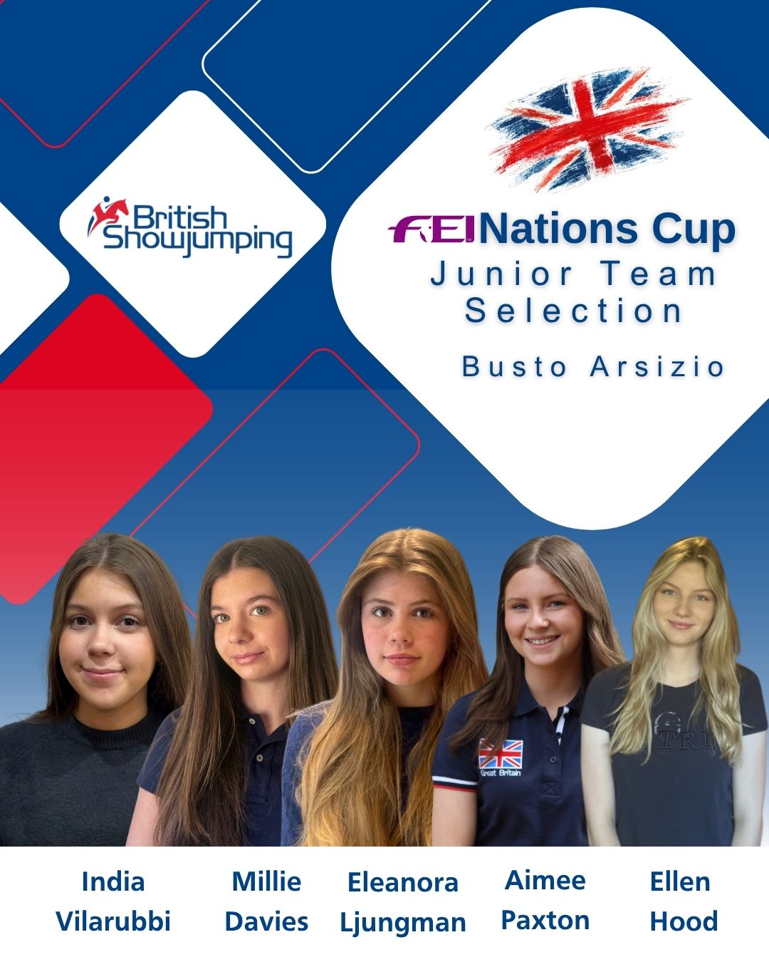 The following three youth squads have been selected to represent Great Britain at the FEI Jumping Youth Nations Cup of Busto Arsizio (ITA). The competition takes place between 28 April – 3 May 2026 at the Etrea Sports Association.